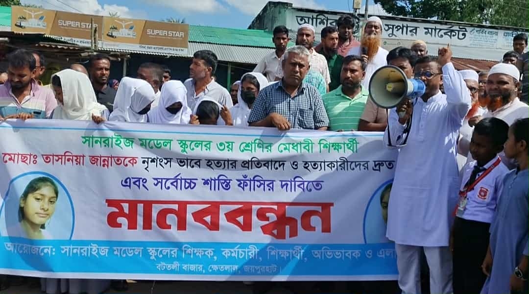 ক্ষেতলালে তৃতীয় শ্রেণীর শিক্ষার্থী হত্যার প্রতিবাদে মানববন্ধন