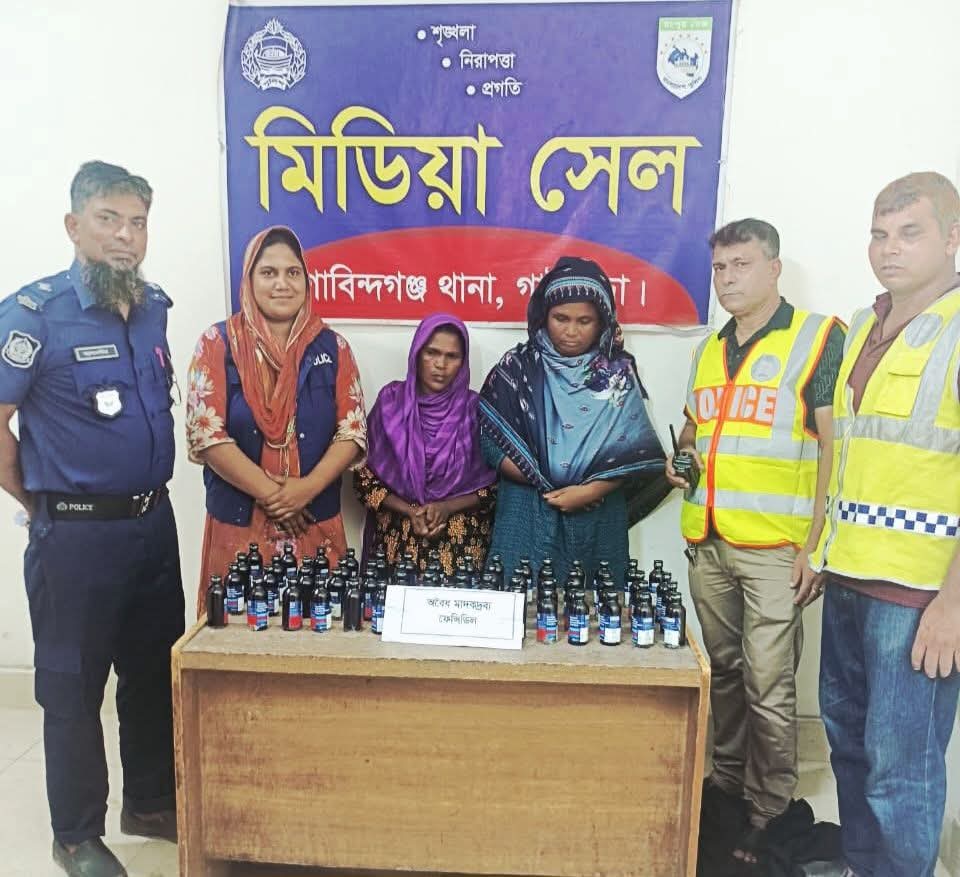 ছবিঃ সীমান্তের আওয়াজ গাইবান্ধা প্রতিনিধিঃ ৬ সেপ্টেম্বর ২০২৫, ২২ আশ্বিন ১৪৩২ গাইবান্ধার গোবিন্দগঞ্জে ৬০ বোতল ফেন্সিডিলসহ দুই নারী মাদক কারবারিকে