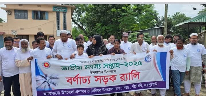 ছবিঃ সীমান্তের আওয়াজ পাঁচবিবি (জয়পুরহাট) প্রতিনিধিঃ ২৪ আগষ্ট, ২৫ জয়পুরহাটের পাঁচবিবি সিনিয়র উপজেলা মৎস্য অফিসের আয়োজনে মৎস্য সপ্তাহের সমাপনী অনুষ্ঠিত
