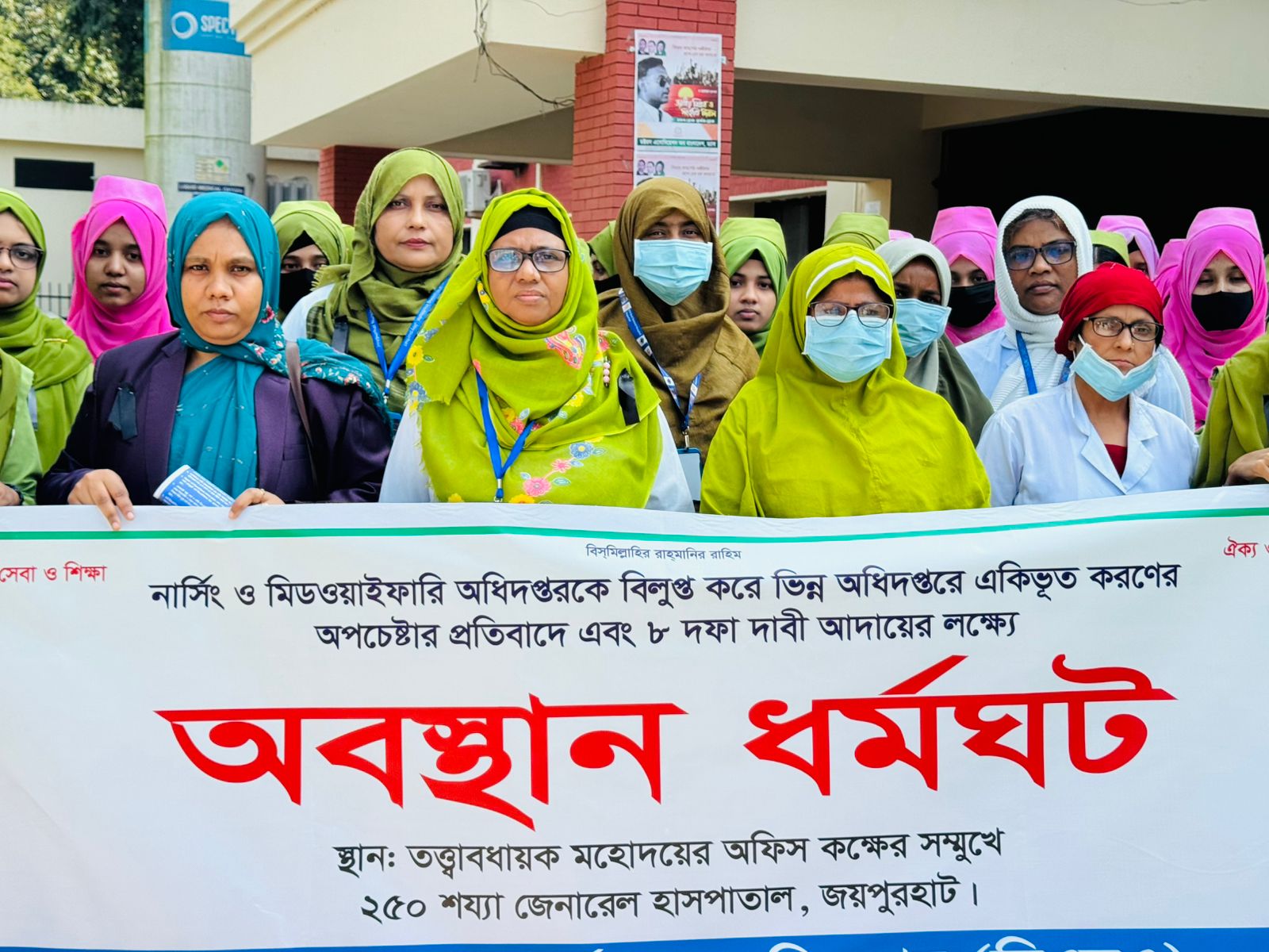 ৮ দফা দাবীতে জয়পুরহাটে নার্স- মিডওয়াইফদের অবস্থান কর্মসূচি পালন