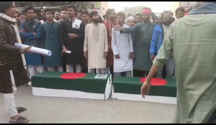 ওসমান হাদির হত্যার প্রতিবাদে নওগাঁয় ছাত্র-জনতার কফিন মিছিল