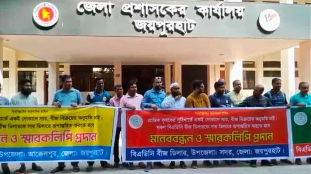 জয়পুরহাটে বিএডিসি বীজ ডিলারদের সার ডিলার হিসেবে নিবন্ধনের দাবিতে মানববন্ধন